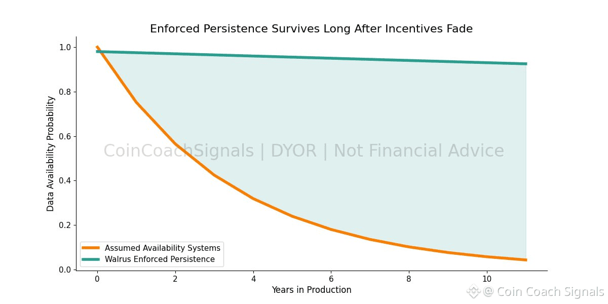 Time is where most weak designs are exposed. Availability is rarely stressed when systems are young. It is stressed years later, when participation thins and incentives weaken. Many networks degrade quietly during this period. Nothing fails outright, but guarantees erode. Walrus is built to resist that slow decay by aligning incentives with continued availability rather than short-term activity.