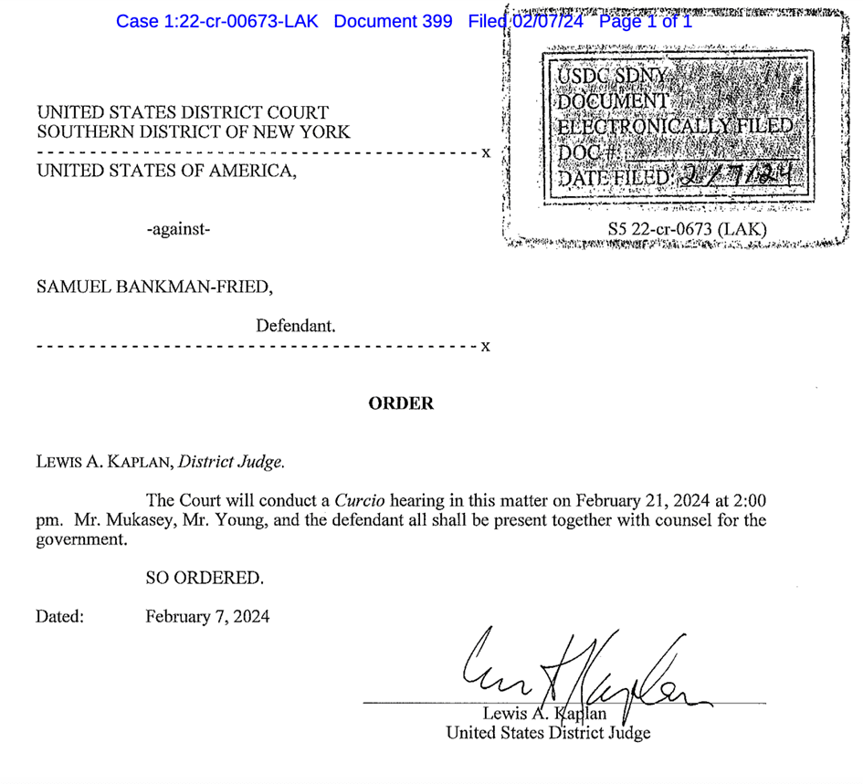 7. února nařídil soudce Lewis Kaplan z okresního soudu Spojených států pro jižní obvod New Yorku Bankman-Friedovi, aby se osobně zúčastnil slyšení 21. února. Tento příkaz pramení z obav ohledně jeho právníků, Marca Mukaseyho a Torrey Younga, a možného střetu zájmů.