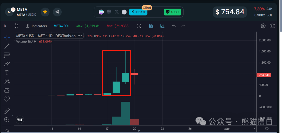 Jeho token Meta (smluvní adresa: METADDFL6wWMWEokTFJwcThTbUmtarRJZjRpzUvkxhr) také během tří dnů vyletěl z 50 USD na nejvyšší úroveň pinů 1 600 USD a o den později klesl zpět na 754 USD.