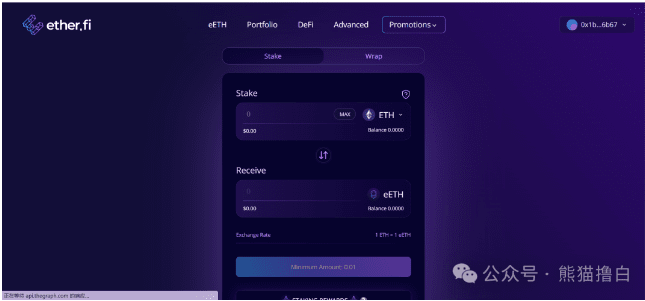 1. Přejděte na https://app.ether.fi/ a propojte peněženku, zavazte se ETH, abyste získali eETH a získali úrok