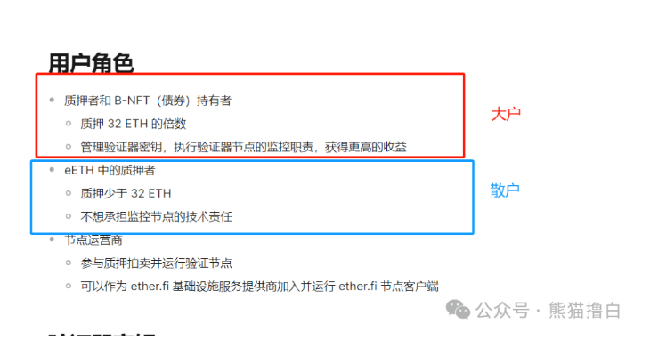 Uživatelské role účastnící se ether.fi jsou následující. Zaměřme se na první dvě. ether.fi pomáhá uživatelům opustit likviditu zavedením T-NFT, B-NFT a eETH pro různé role.