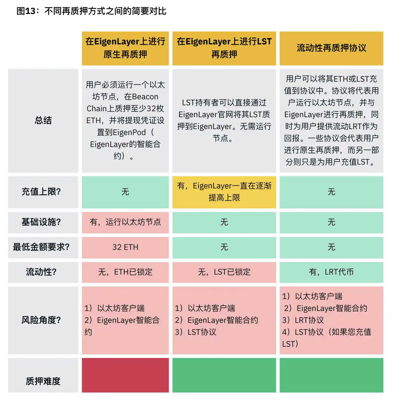 Takže když už existuje dohoda o opětovném zajištění likvidity jako EignLayer, proč stále existují protokoly o opětovném zajištění likvidity jako ether.fi a buffer? Protože v současné době existují tři hlavní metody opětovného zástavy: nativní opětovné zástavy EigenLayer, opětovné zástavy EigenLayer LST a dohoda o opětovném zástavě likvidity Následuje krátké srovnání mezi třemi různými způsoby sázky.