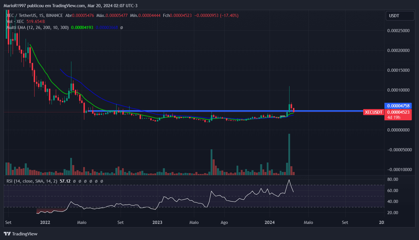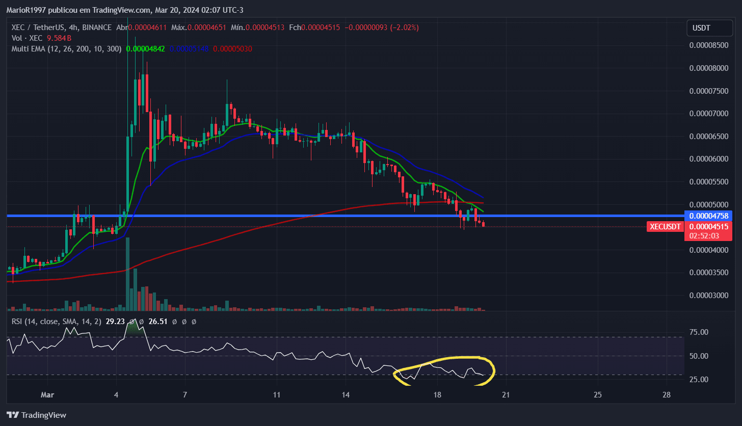 Příkladem je $XEC , který je aktuálně podporován na týdenním grafu (1W). Dále jsme pozorovali, že na 4hodinovém (4H) grafu indikátor Relative Strength Index (RSI) dosáhl úrovně přeprodanosti (30), což naznačuje možnost tvorby cenové základny.