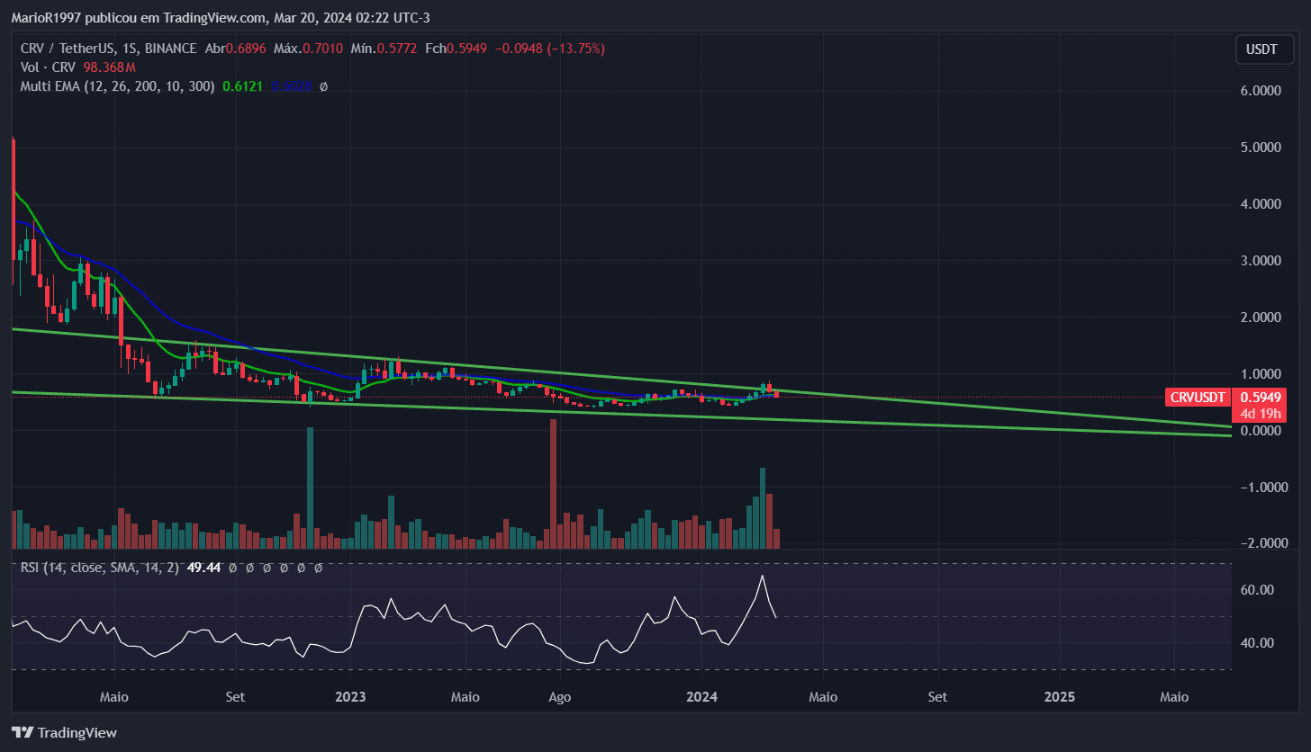 CRV, které je na týdenním grafu (1W) stále uvězněno ve velkém klesajícím klínu, s RSI na úrovni přeprodanosti na 4hodinovém grafu.