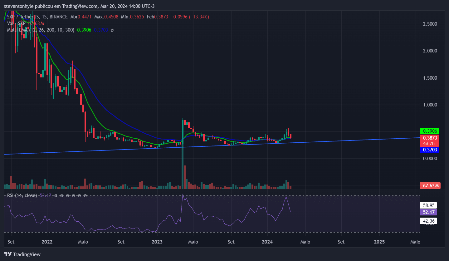 Máme také $SXP , který na týdenním grafu zůstal na vzestupné linii (LTA) a jako podporu použil klouzavé průměry za 12 a 26 období. Navíc na 4hodinovém grafu také dosáhl úrovně přeprodanosti RSI.