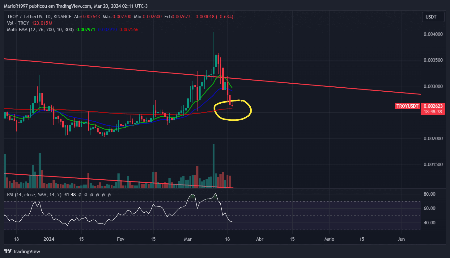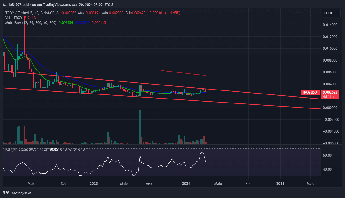Další kryptoměnou je $TROY , která je na týdenním grafu (1W) stále uvězněna ve velkém sestupném klínovém vzoru, který má vyšší pravděpodobnost proražení směrem nahoru. Na 4hodinovém (4H) grafu jsme také dosáhli úrovně přeprodanosti RSI, což může naznačovat dočasnou cenovou základnu.