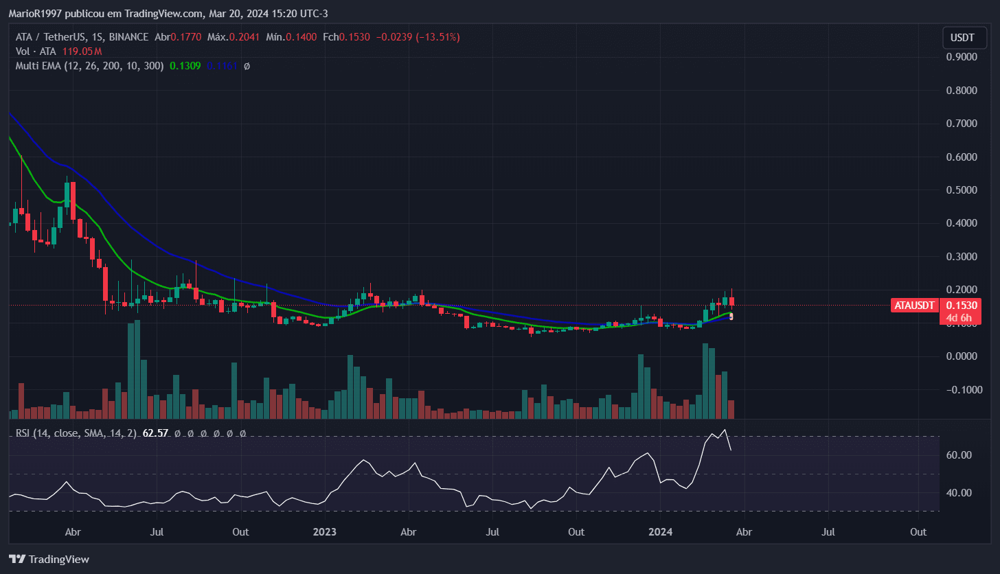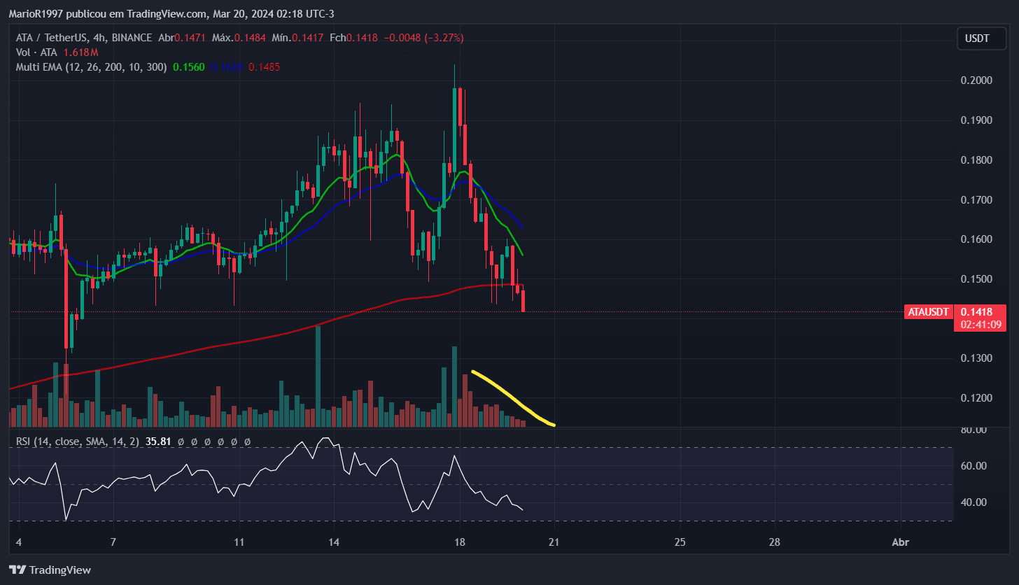 Pokračujeme v analýze, kryptoměna ATA demonstruje tvorbu podpory na týdenním grafu (1W), ve stejnou dobu, kdy indikátor RSI dosahuje úrovně přeprodanosti na 4hodinovém grafu (4H). Kromě toho používá jako podporu klouzavý průměr za 200 období a je zaznamenáno snížení objemu prodeje. Tyto známky naznačují vytvoření pevné cenové základny pro toto aktivum.