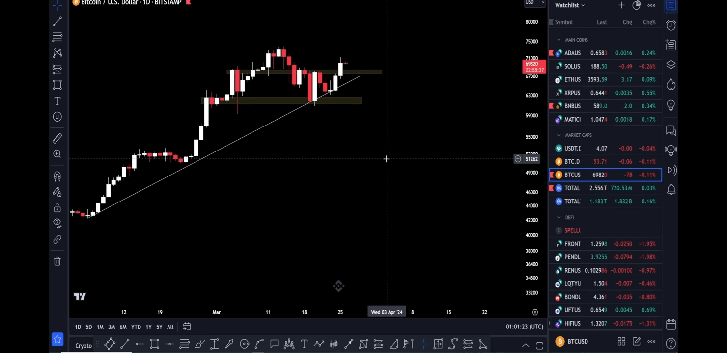 Tento graf ukazuje, že dominance USDT se od této trendové linie mnohokrát odrazila. Nyní je sportovní zóna 3,7 % a odrazí se od této zóny mnohokrát v minulosti a pokaždé, když btc havaruje. Znovu se odrazí od této trendové linie a btc klesne ze 73 000 na 60 000, ale nyní je to opět v tomto bodě. Nyní očekáváme, že dominance usdt prolomí tuto zónu a pokud se prolomí, další sportovní úroveň bude 2,7 %. Což jasně ukazuje, že se btc posune až na 90k nebo 95k. Ale můžeme se dočkat nějaké korekce nebo likvidace, jak se uchvátí z 67500 na 68000 a pak se btc znovu vzpamatuje. Sledujte oba grafy a buďte opatrní.