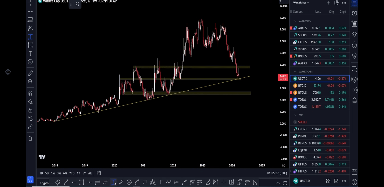 Lidé neustále sledují BTC, ale ignorují graf dominance usdt, který ovlivňuje BTC. Pokusím se vám ukázat některá fakta v níže uvedených grafech.