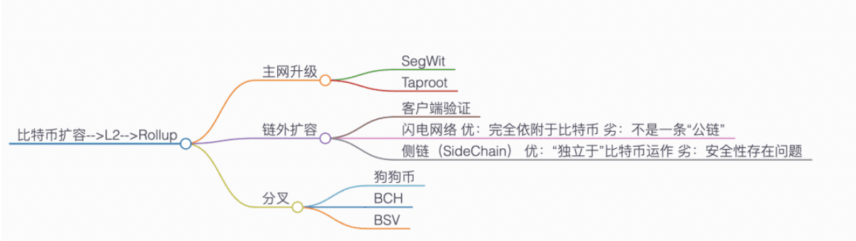 V procesu vývoje bitcoinu již dlouhou dobu existují tři praktické metody cesty expanze. Nejnižší úrovní jsou upgrady mainnetu, jako je SegWit a Taproot. Druhým je expanze mimo řetězec, jako je ověřování klientů, blesková síť a postranní řetězce. Konečně existují přímé forky, jako je Dogecoin, BSV a BCH.