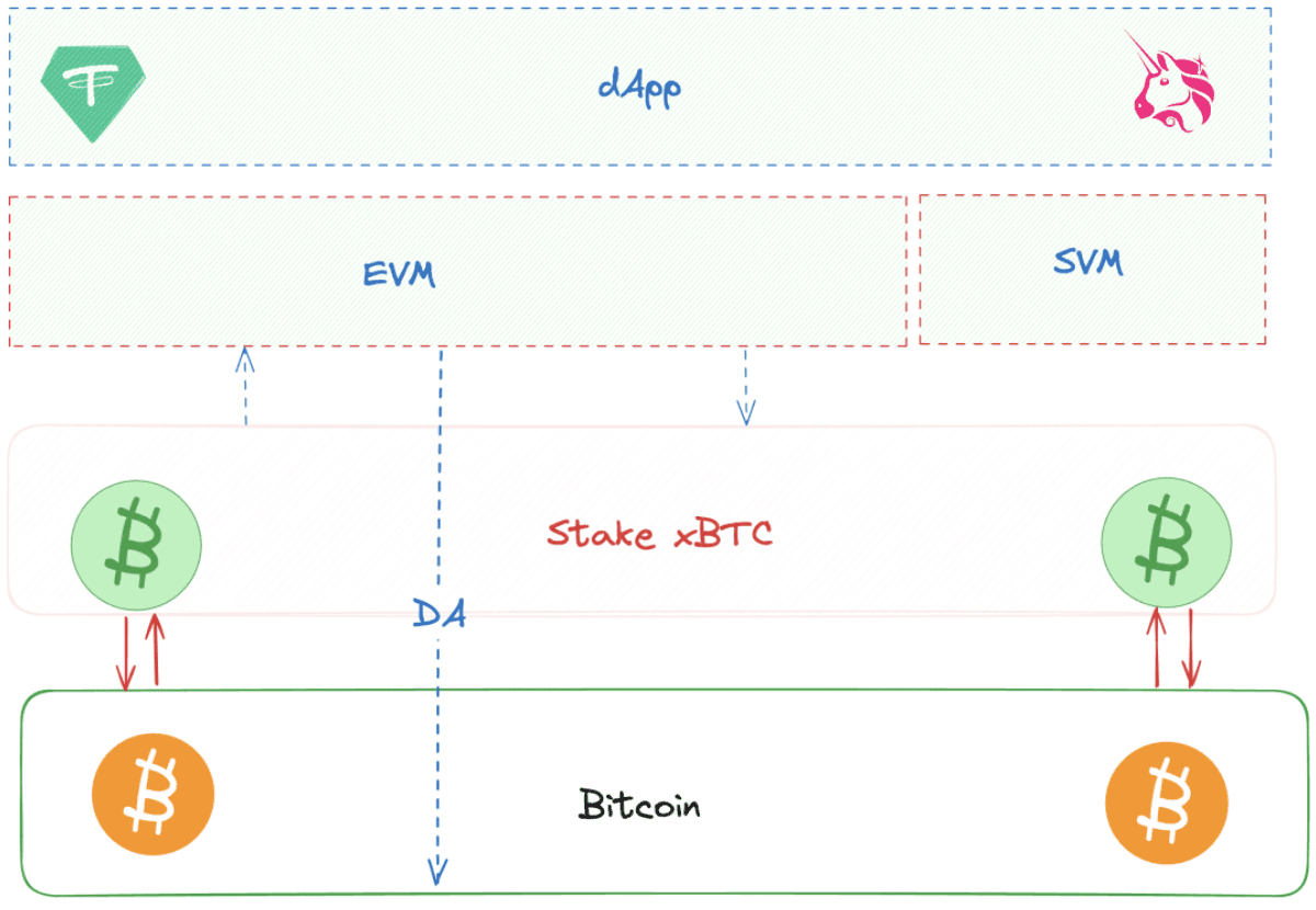 BTC staví PoS systém pro zajištění bezpečnosti a používá mechanismus bez oprávnění pro přístup a zničení, který se liší od stávajícího systému založeného na aktivech. Příjem ze zástavy BTC bude plně vypočítán v BTC a tokeny projektu nemohou mít funkční konflikty s BTC. Vrstva Rollup computing musí splňovat jak rozsáhlé požadavky, tak požadavky na soukromí a používá technologii šifrování k boji proti centralizačním tendencím. Rollup nemůže vytvářet další vrstvy DA a striktně používá bitcoiny jako řešení DA.