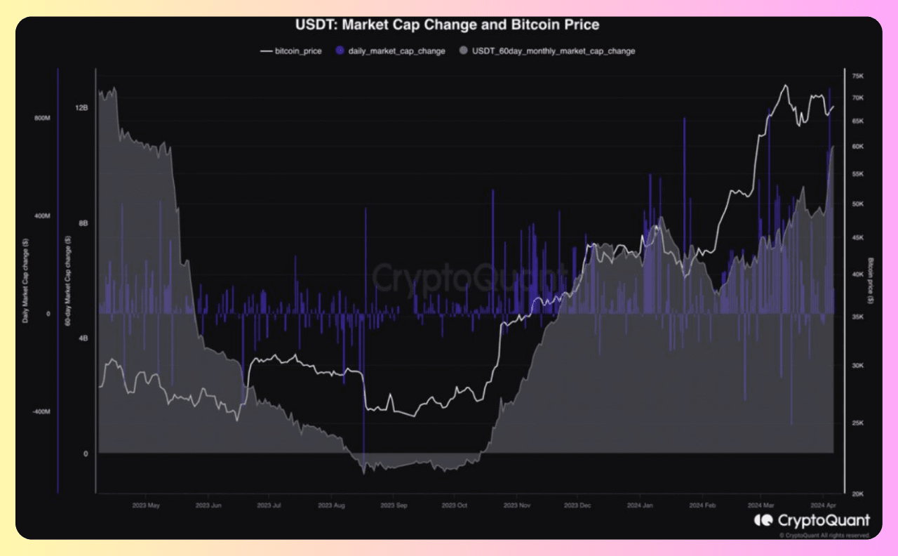 3. Byl vyražen nový USDT a jak můžete vidět, existuje silná korelace mezi tržní kapitalizací USDT a cenou bitcoinu.