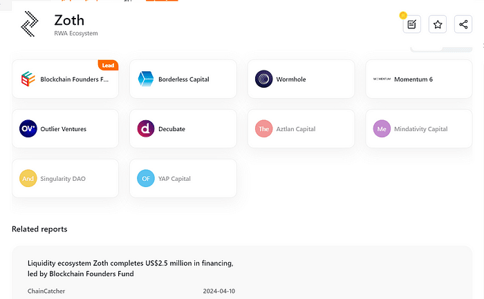 Zoth je ekosystém, který propojuje tradiční finance s likviditou v řetězci a aktivy reálného světa (RWA). Její vlajkový produkt, ZOTH-FI, je institucionální trh s pevným příjmem, který nabízí RWA, jako je financování přeshraničního obchodu, pokladniční poukázky a státní dluhopisy. Nedávno 10. dubna 2024 dokončili kolo financování ve výši 2,5 milionu dolarů, vedené fondem Blockchain Founders Fund, s dalšími investory včetně Borderless Capital, Mindativity Capital, YAP Capital, Momentum6, Singularity DAO, Aztlan Capital, Outlier Ventures, Decubate a Wormhole Ecosystem Fund. .