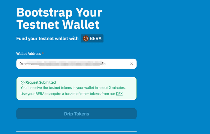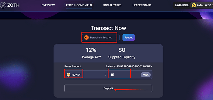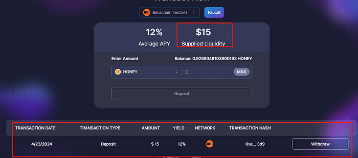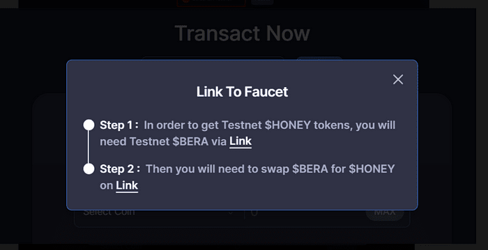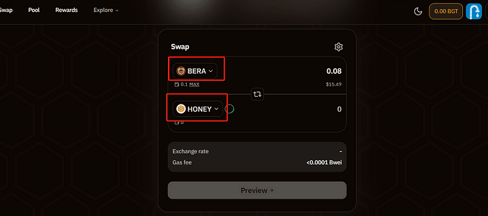 ➢ Získejte testovací tokeny Nejprve vyberte Berachain Testnet u faucetu (obrázek 1). Poté pomocí odkazu vyzvedněte testovací tokeny BERA podle pokynů (obrázek 2 + obrázek 3). * Vyměňte tokeny BERA za MEDOVÉ coiny, ale nevyměňujte všechny; nezapomeňte si ponechat nějaké tokeny BERA (obrázek 4). ➢Vsaďte žetony HONEY (doporučuje se ponechat si malou částku) (obrázek 5), a jakmile jsou vsazeny, měly by vypadat jako na obrázku (obrázek 6).