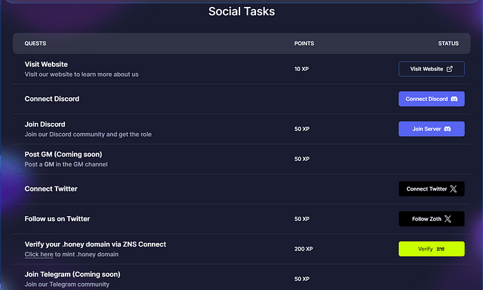 Nyní Zoth spustil úkoly na testovací síti, kde účastníci obdrží odznaky za úspěchy a budou mít možnost se podělit o odměnu za výsadek ve výši 20 milionů $ ZOTH. Připojte se nyní a staňte se prvním účastníkem!