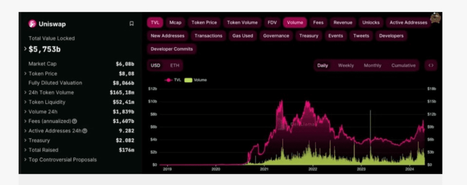Slavný Uniswap (UNI) TVL je DeFi. Zdroj: DefiLlama