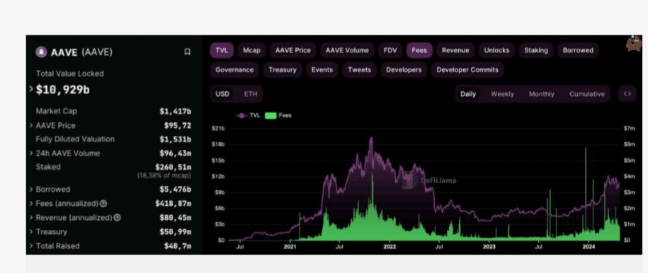 Данные Aave (AAVE) TVL a DeFi. Икточник: DefiLlama