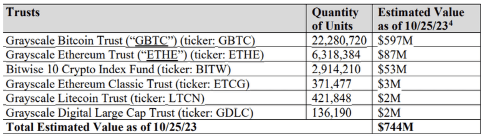 Aktiva ve výši 873 milionů USD zahrnují podíly FTX v různých trustech spravovaných společností Grayscale Investments v hodnotě 807 milionů USD a Bitwise v hodnotě 66 milionů USD. Tyto trusty zahrnují mimo jiné významná aktiva, jako je Grayscale Bitcoin Trust (GBTC), Grayscale Ethereum Trust (ETHE), Bitwise 10 Crypto Index Fund (BITW).