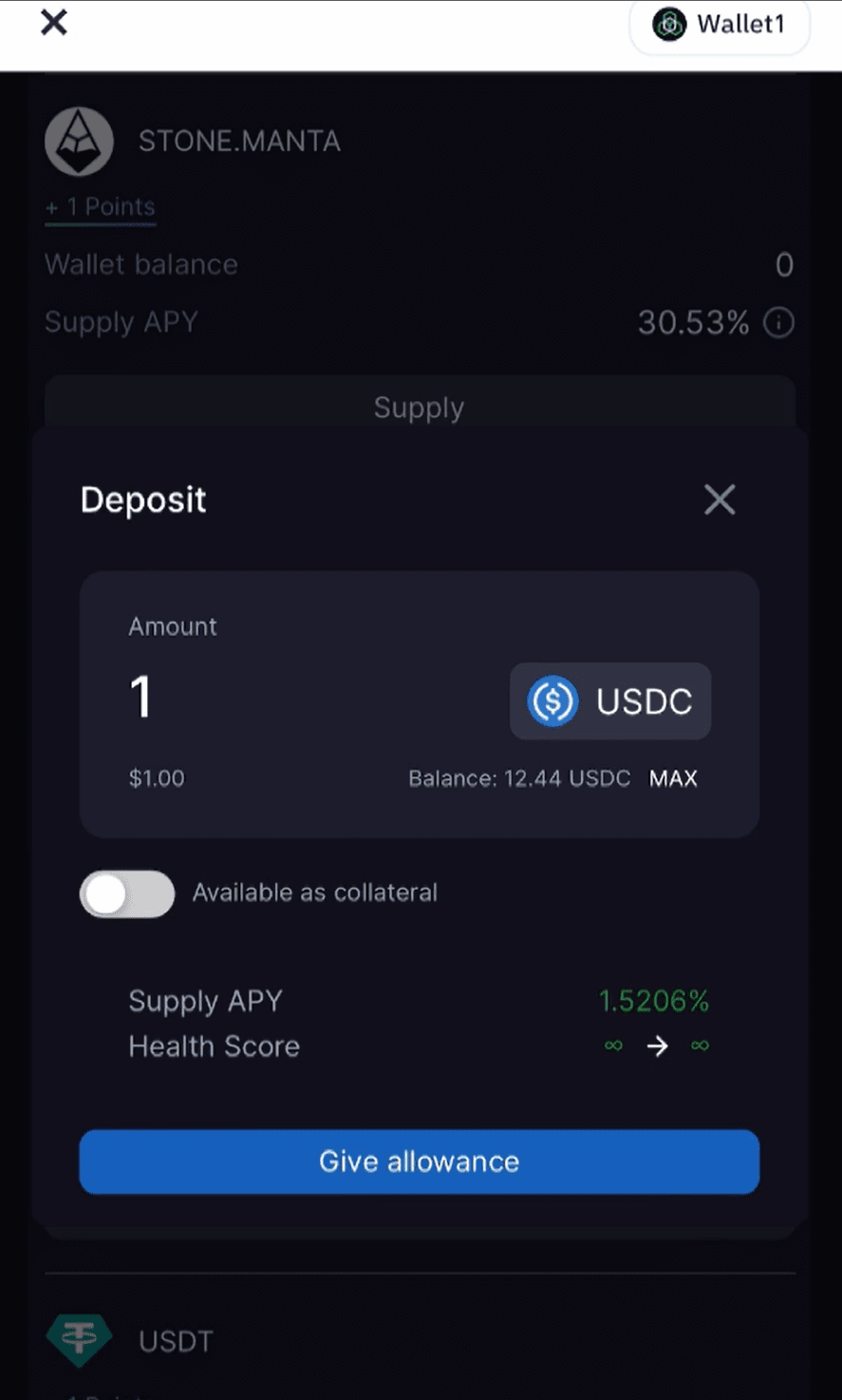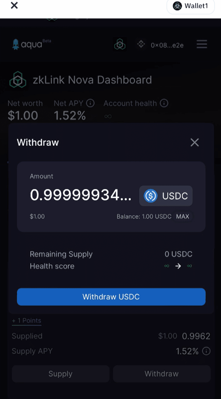 Poté se vraťte do Aqua Liquidity Supply, najděte USDC, klikněte na Supply a zadejte 1USDC. Totéž platí pro Uložení USDC a nemějte obavy, že uvidíte tolik online procedur Zde bude poplatek odečten Ve skutečnosti systém potřebuje pouze potvrdit, že váš zůstatek na řetězu je dostatečný pro tento proces Swap a další poplatky nebudou skutečně odečteny, takže se nenechte odradit jen tím, že to uvidíte, když dokončíte úkol, můžete také okamžitě vybrat Vyhněte se dlouhým nocím a snům Můžete se vrátit na stránku s klidem a stisknout ověření, abyste dokončili náš čtvrtý úkol