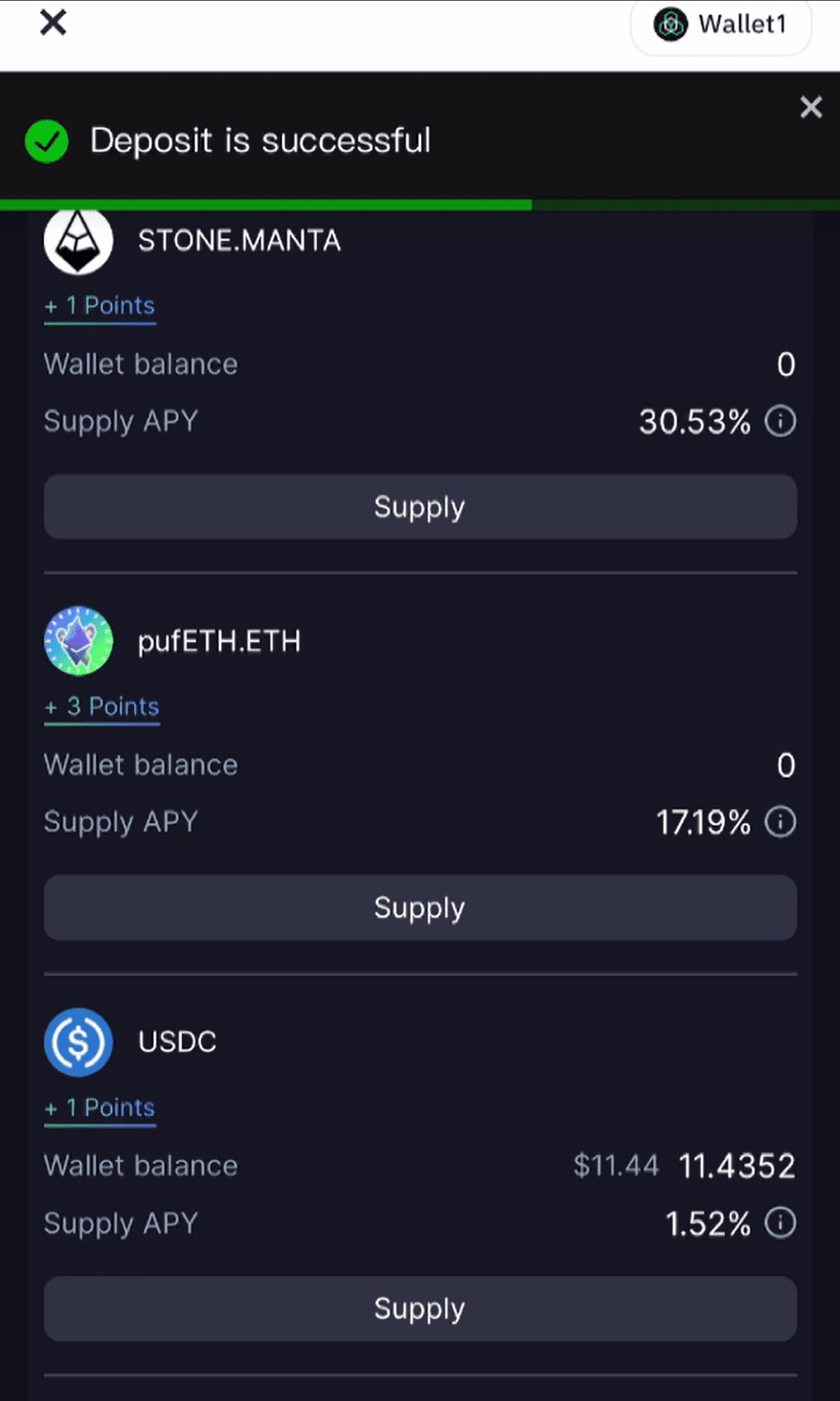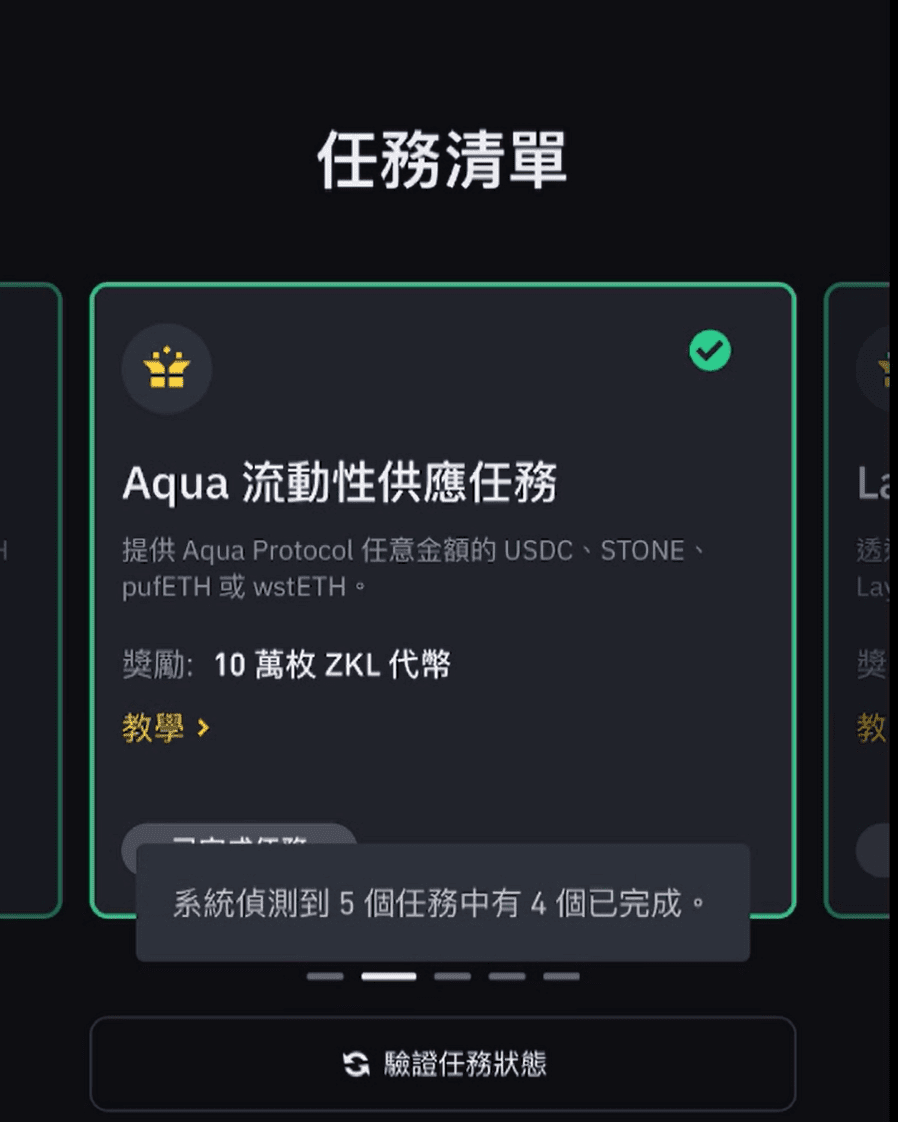 Pak jsme bez přestání rychle přešli k druhému úkolu, Vklad v LayerBank, určitě si pomyslí, proč bychom měli přeskočit předchozí úkoly a udělat to jako první Je to jen proto, že bratr J věří, že tento úkol lze provést pouze pomocí ETH hodnota se shoduje s naším předchozím úkolem, takže to uděláme nejprve Klikněte na LayerBank Nejprve propojíme peněženku a řetězec zkLink Nova Zde uvidíte, že existuje mnoho uložených hodnot, jako je USDC, USDT atd úkol Používáme pouze ETH, takže se řiďte předpisy zde a možná zjistíte, že v peněžence není žádný zůstatek uvízly zde a nelze provést, musíte znovu kliknout na Dostupné jako zajištění, aby se zobrazila možnost připojení peněženky, poté znovu kliknout na Binance web3 peněženka, akci zopakovat a stisknout Supply & Borrow, zobrazí se zůstatek peněženky V prvním úkolu přejdeme na ETH řetězce zkLink Nova, poté vyplníme 0,001 ETH, stiskneme tlačítko Dodávka, dokončete interakci se smlouvou a uvidíte úspěšnou půjčku, a poté okamžitě stáhneme prostředky, abychom tomu zabránili. zapomenete vybrat peníze a nebudete se moci zúčastnit následných úkolů. Také počkejte 2 minuty, vraťte se na stránku a stiskněte ověřit. Ukáže se, že dva z pěti úkolů byly dokončeny.