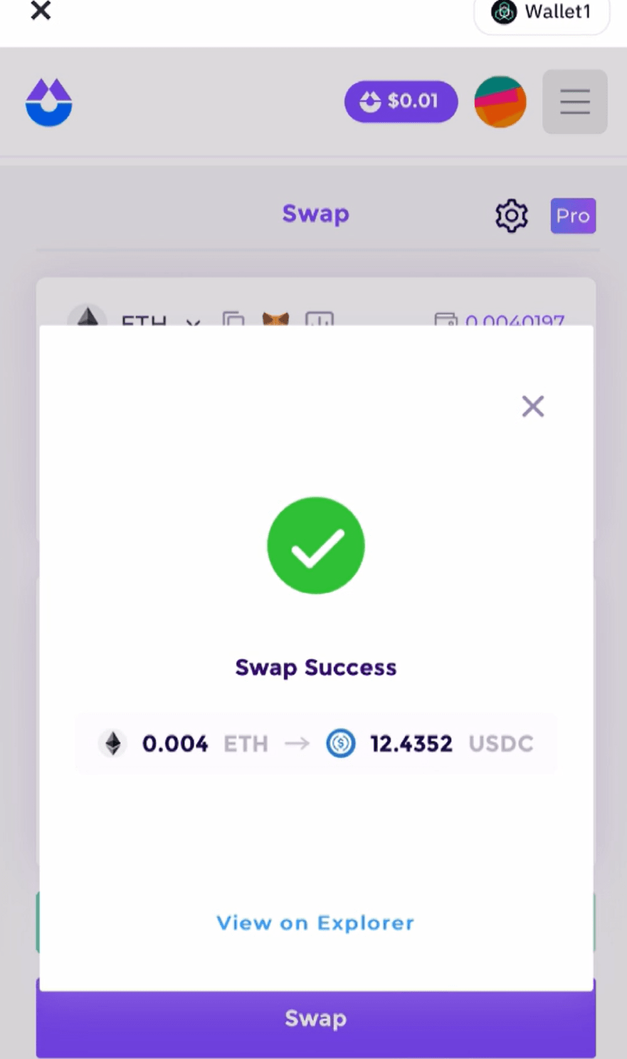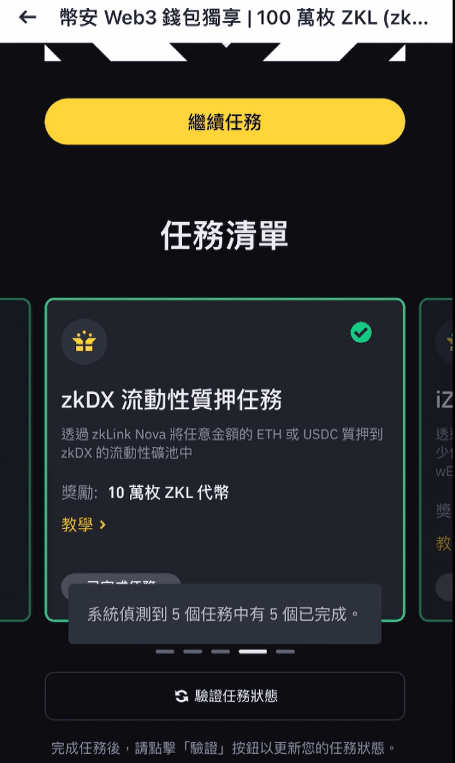 Třetí úkol je také skok, převést ETH na našem řetězci zkLink Nova na USDC, takže je to dokončeno přes iZiSwap. Pokud přítel měny udělá chybu v připojení peněženky Zavřete a znovu otevřete aplikaci Binance a potvrďte, že je připojena k řetězci Nova. Můžete stisknout tlačítko Swap, dokud se neobjeví zůstatek v peněžence. Zde si také musíte zarezervovat nějaký poplatek za plyn pro interakci se smlouvou bude dokončeno, stiskněte Ověřit a dokončili jste tři položky.