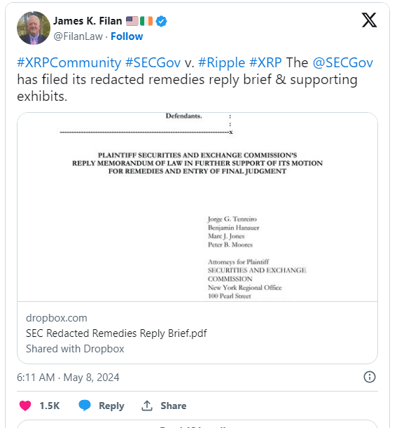V úterý americký SEC podal stručnou odpověď na nápravu a podporu exponátů pod pečetí. Kromě toho Ripple podal své redigované opravné prostředky, stručnou odpověď a podpůrné exponáty při vstupu ke konečnému rozsudku.