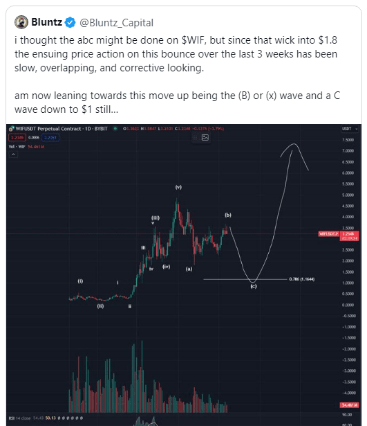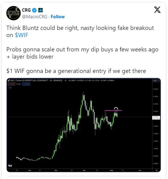 Prominentní analytik kryptoměn @MacroCRG označil možná zavádějící průlom v cenové trajektorii WIF, popsal současný nárůst cen jako „generační vstupní bod“ a spekuloval, že nemusí být udržitelný a může jít až na 1 $.