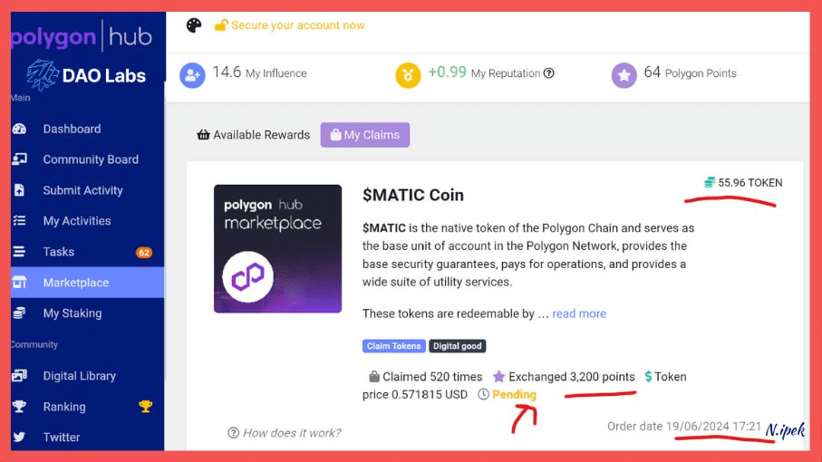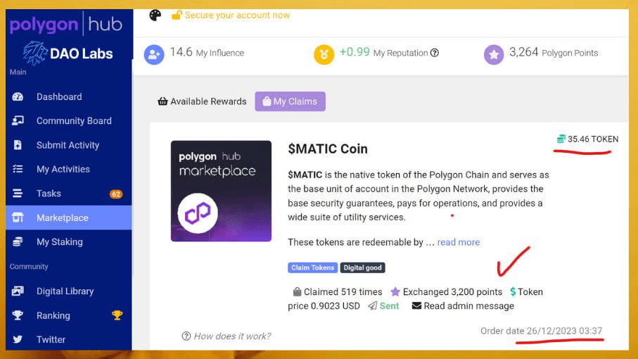 Loni v prosinci jsem měl také 3200 bodů a své body jsem na tržišti převedl na tokeny MATIC. Pak byla cena MATIC 0,90 $ a se svými 3200 body jsem byl schopen získat 35 MATIC.