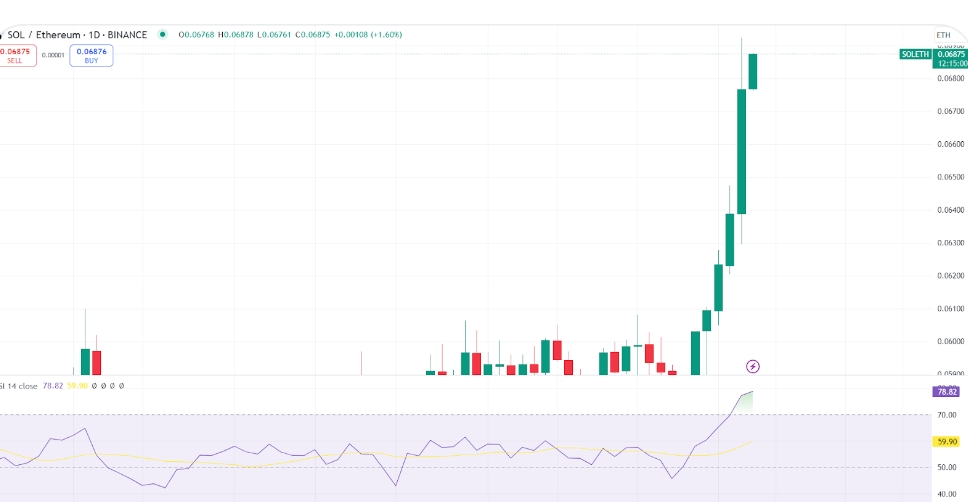 Der RSI-Indikator für das SOL/ETH-Paar im Tageschart liegt jetzt bei 78,17 und betritt die überkaufte Zone. Traditionell signalisiert dies eine potenzielle Preisbereinigung, obwohl es keine unmittelbare Rückkehr garantiert. Es könnte darauf hindeuten, dass der Markt sich abkühlen könnte, bevor er seinen Aufwärtstrend fortsetzt.