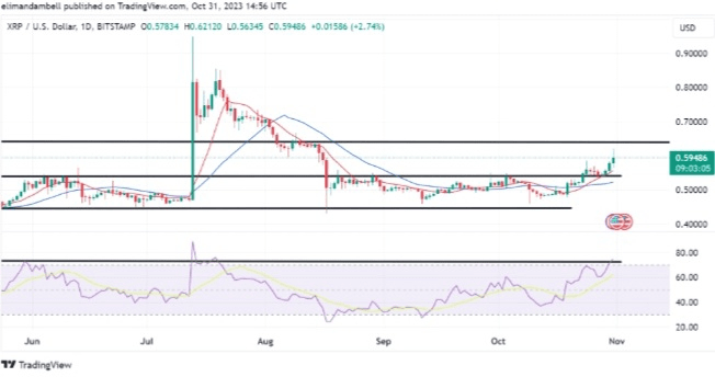 Nach einem Tief von 0,5634 $ zu Beginn der Woche stieg XRP/USD heute früh auf ein Intraday-Hoch von 0,6127 $.