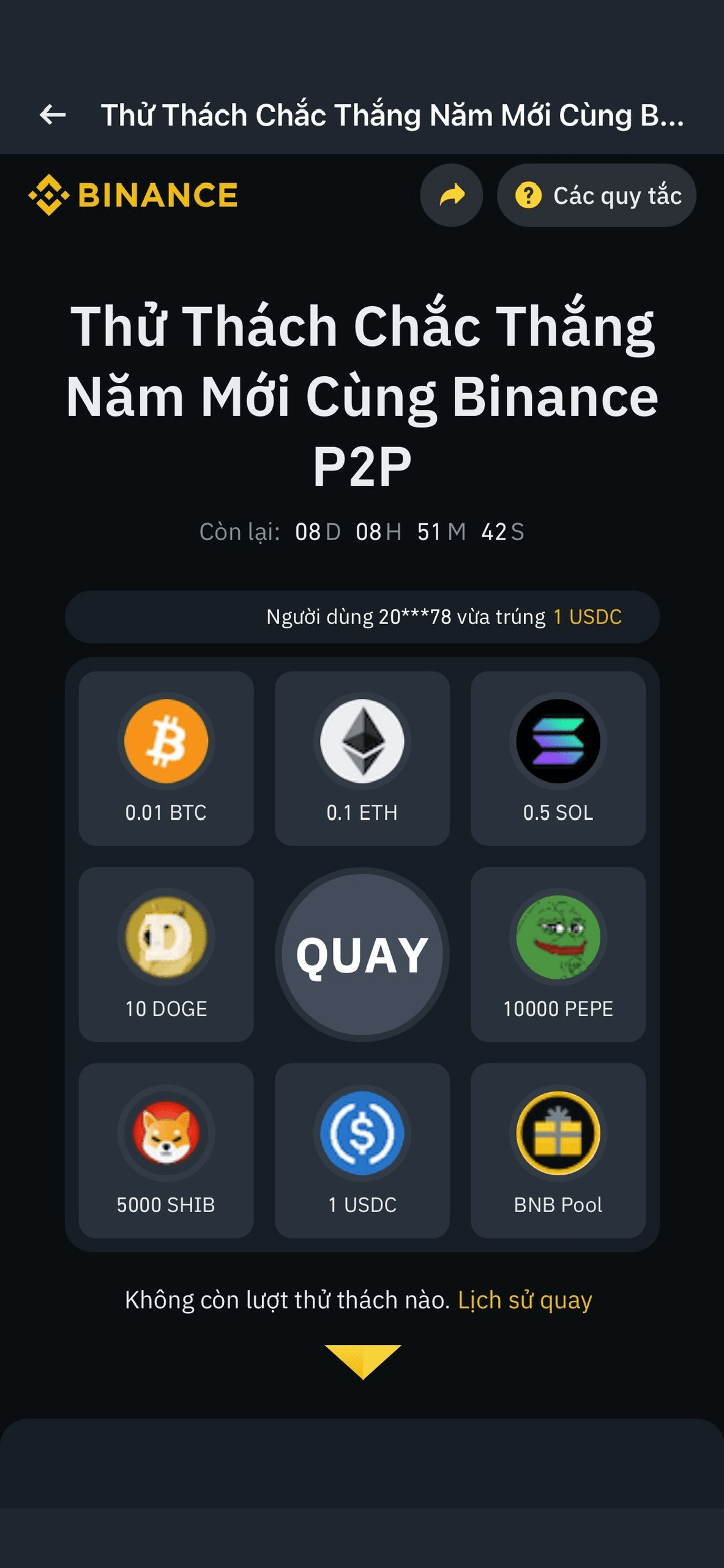 Zum Abschluss des alten Jahres 2024 startete Binance P2P die Neujahrsfeier 2025 exklusiv für Benutzer in einigen asiatischen Ländern. Alle gültigen Benutzer können teilnehmen und 100 % Belohnungen für die aktuell angesagtesten Token wie BTC, ETH, BNB, SOL, DOGE, SHIB, PEPE und USDC mit einem Gesamtprämienfonds von 10.000 USD erhalten! Berechtigte Benutzer, die den Kauf von Kryptowährungen über P2P abschließen, haben die Möglichkeit, eine Belohnung von bis zu 1.000 US-Dollar in BTC zu erhalten.
