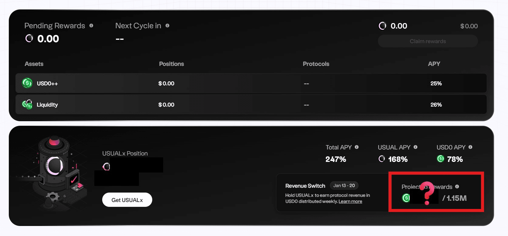 Wenn Sie USUALx staken, können Sie jetzt Ihre projizierten USD0-Belohnungen für die Woche im Dashboard im Abschnitt „Projizierte Belohnungen“ überprüfen. Ihre Belohnungen werden an diesem Montag, den 20. Januar, verteilt. Verpassen Sie es nicht – beginnen Sie jetzt, Ihre Einnahmen zu verfolgen!