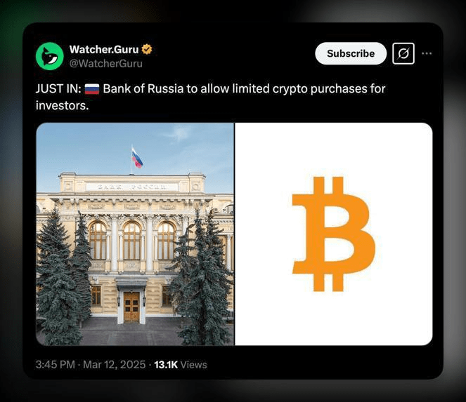 🔵 Die Bank von Russland hat ein experimentelles Rechtsregime für 3 Jahre vorgeschlagen, das einer begrenzten Anzahl von Investoren den Handel mit Krypto-Assets ermöglicht.