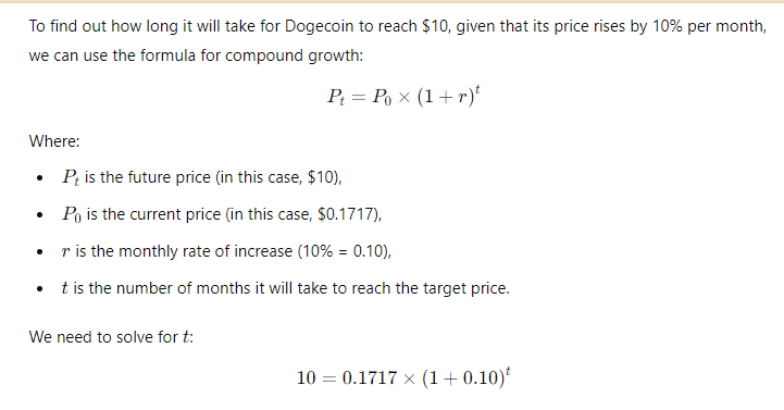 Angesichts des aktuellen Skeptizismus hinsichtlich des Potenzials von Dogecoin, schauen wir uns genauer an, wie lange es dauern könnte, bis die Meme-Münze $10 erreicht, vorausgesetzt, es gibt ein konstantes monatliches Wachstum von 10 %.