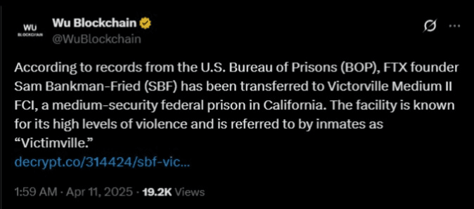 Mit 32 Jahren wurde Sam Bankman-Fried nach Victorville verlegt, nachdem er mehr als ein Jahr im Brooklyn Metropolitan Detention Center und einem kurzen Aufenthalt in einem bundesstaatlichen Übergangscenter in Oklahoma verbracht hatte. Sein Umzug erfolgte kurz nach einem nicht autorisierten Interview mit dem Journalisten Tucker Carlson, in dem er das Alltagsleben in der Brooklyn-Anstalt beschrieb. Nach dem Interview wurde er Berichten zufolge in Einzelhaft gehalten.