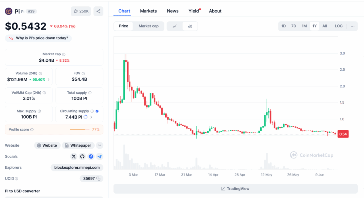 Derzeit wird der PI-Coin zu einem Wert von 0,54 $ gehandelt, mit einem Handelsvolumen von über 100 Millionen Dollar. Die Marktkapitalisierung von PI beträgt 4 Milliarden Dollar, während ein erheblicher Betrag noch gesperrt ist. Das zirkulierende Angebot liegt bei 7,5 Milliarden, während das Gesamtangebot 100 Milliarden beträgt, was darauf hinweist, dass die tatsächliche Welle von Investoren noch kommen muss.