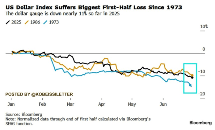 In jedem Fall bleibt die Leistung des Dollars seit Donald Trumps Amtsantritt schwach. Der gleiche Bericht von TKL hebt hervor, dass der Dollarindex auf dem schlechtesten Stand seit 1986 ist. Darüber hinaus deutet das Diagramm darauf hin, dass es, wenn dieser Trend anhält, sogar schlimmer sein könnte als der schlechte Zustand von 1973.
