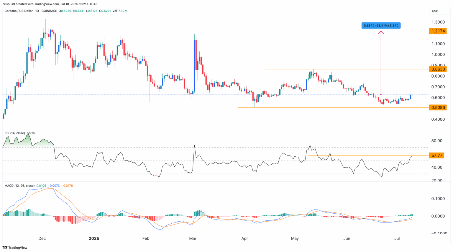 Der ADA-Preis hat sich in den letzten Tagen moderat erholt, und seine starken Kennzahlen deuten auf weitere Gewinne in diesem Jahr hin. Das anfängliche Ziel ist ein Anstieg von 40 % zur Nackenlinie des Doppelbodens bei 0,8630 $, während eine Bewegung über dieses Niveau weitere Gewinne auf 1,2153 $ signalisieren wird.