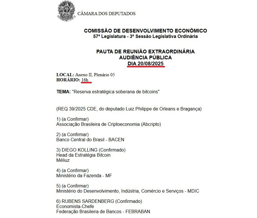 ⚠️ Die erste öffentliche Anhörung zur Diskussion über die Schaffung der Strategischen Souveränen Bitcoin-Reserve (RESBit) in Brasilien findet morgen, am 20. August 2025, um 16 Uhr im Abgeordnetenhaus in Brasília statt.