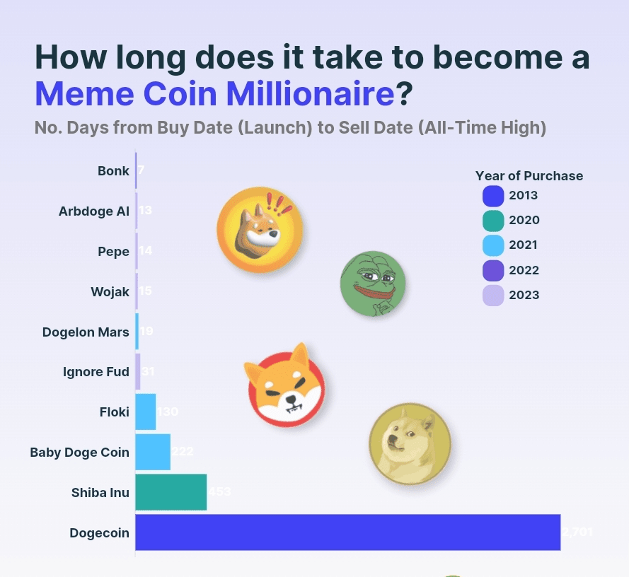 Ein Investor hätte in knapp einem Jahr oder durchschnittlich 361 Tagen zum Meme-Coin-Millionär werden können. Im schnellsten Fall brauchte ein Bonk-Investor nur 7 Tage, um 26.667,85 $ in 1 Million $ zu verwandeln. Im langsamsten Fall brauchte Dogecoin 2.701 Tage oder fast 7,5 Jahre, um aus 819,51 $ 1 Million $ zu machen.