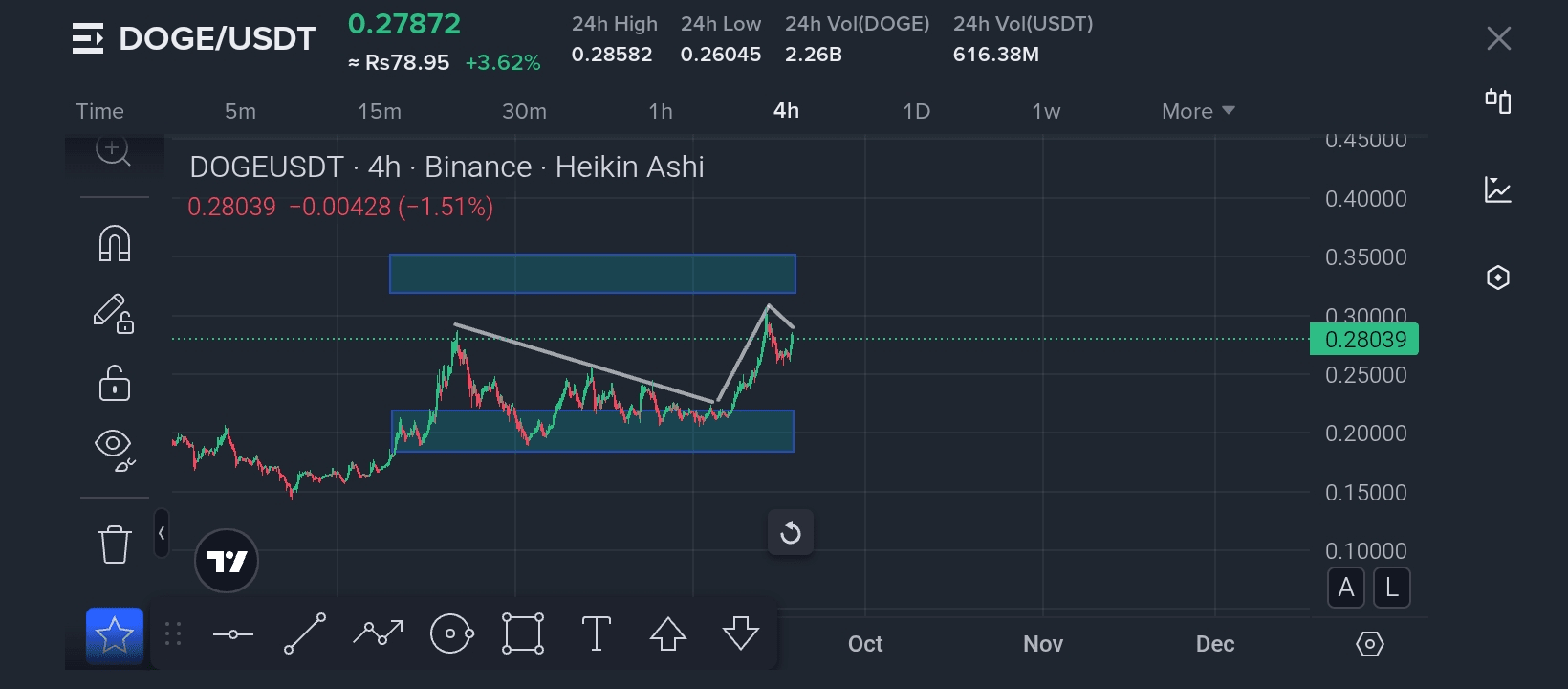Derzeit handelt DOGE bei etwa 0,278 USDT, nachdem es starken Schwung aus der unteren Akkumulationszone (blaues Boxenunterstützung) gezeigt hat. Dieser jüngste Ausbruch bestätigt, dass Käufer aggressiv eingestiegen sind nach einer langen Konsolidierungsphase.