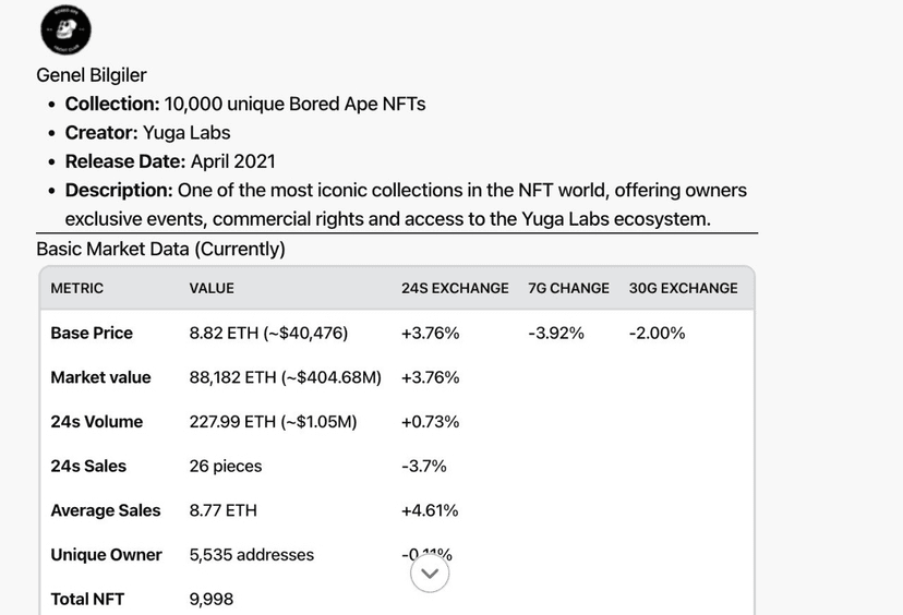 „Analysieren Sie die BAYC-Sammlung.“ Zeigt die Marktdaten und die Geschichte der Sammlung an.