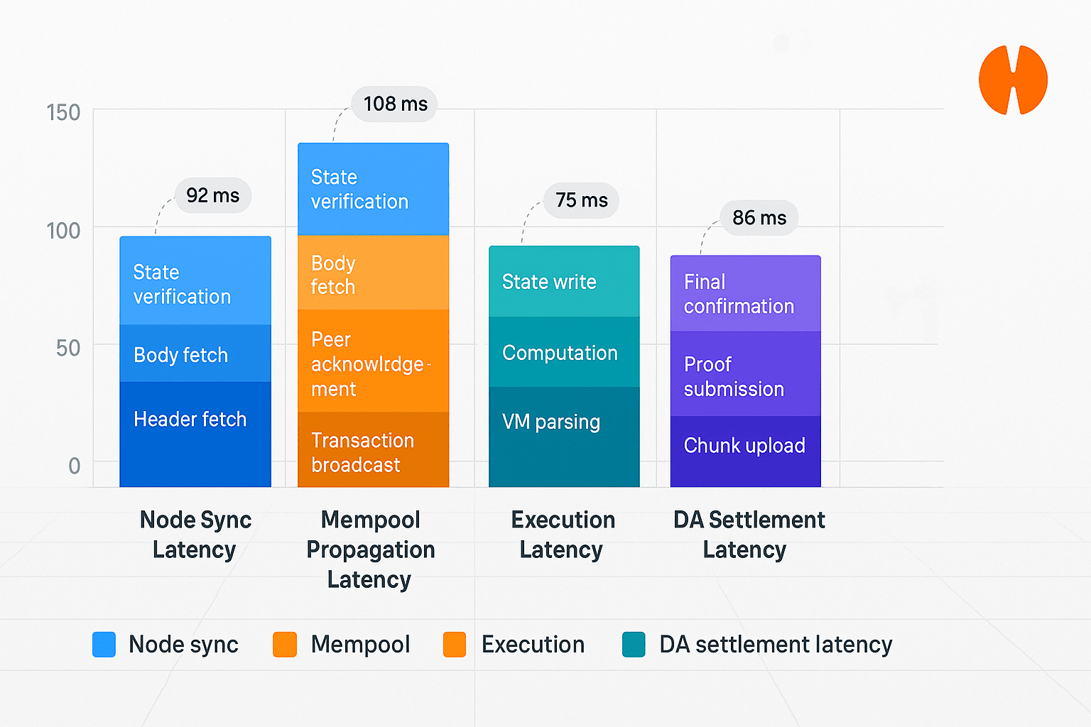@Hemi Das Latenzdesign basiert auf den Prinzipien der Pipeline, indem die Latenzstapel verschiedener Komponenten aggregiert wird, um die Gesamterwartete Verzögerung zu ermitteln. Entwickler sollten verstehen, welche Art von Anwendung in welcher Phase sensitiv ist; beispielsweise sind Mempool- und Ausführungslatenzen bei sofortigen Zahlungen oder Order-Matching von höchster Bedeutung, während DA- und Knoten-Synchronisationslatenzen auch bei großen Wertabwicklungen entscheidend werden. Das Verfolgen von Latenzen in visuellen Formaten wie gestapelten Balken hilft, Engpässe zu identifizieren und SLA-Ziele festzulegen.