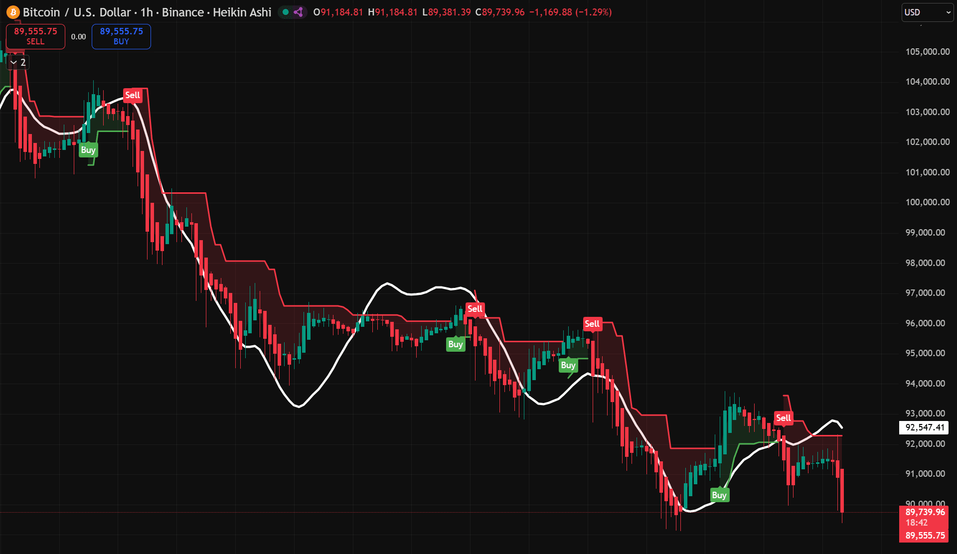 Interaktion der Unterstützungszone: Der Preis berührte ein Tief von $89,381.39, das mit der unteren Grenze des rot schattierten trendfolgendes Indikators übereinstimmt — eine potenzielle Unterstützungszone.