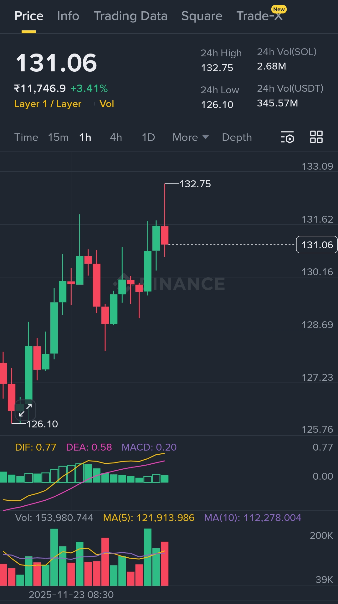Kürzliche Hochablehnung: Die letzten paar Kerzen zeigen, dass der Preis versucht, sich dem 24-Stunden-Hoch von 132,75 zu nähern, aber es nicht schafft, dieses Niveau zu halten, was zu einem oberen Docht und einer Rückkehr zum aktuellen Preis von 131,06 führt. Dies deutet darauf hin, dass Verkaufsdruck in den Markt auftritt.