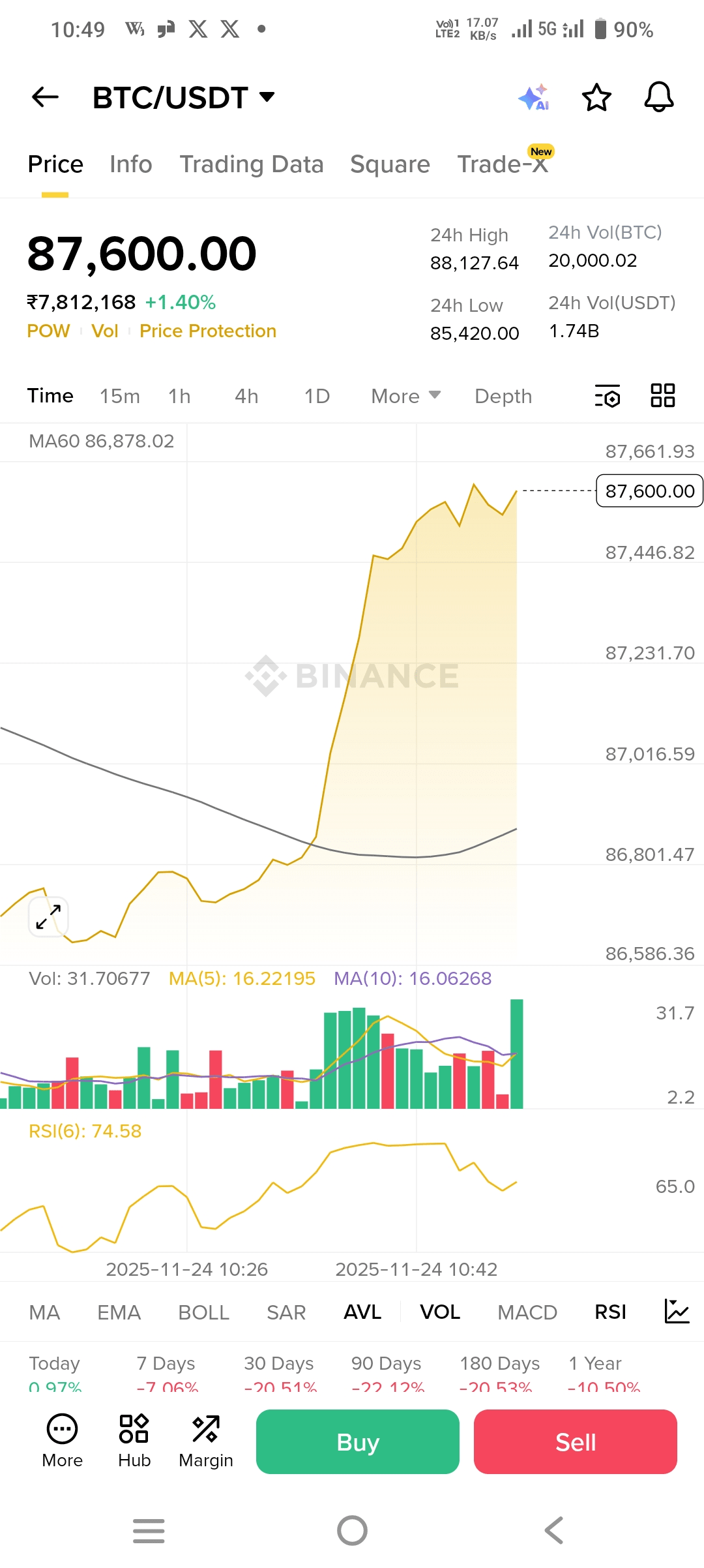 Bitcoin handelt derzeit nahe $87,600 und zeigt eine solide intraday Erholung.