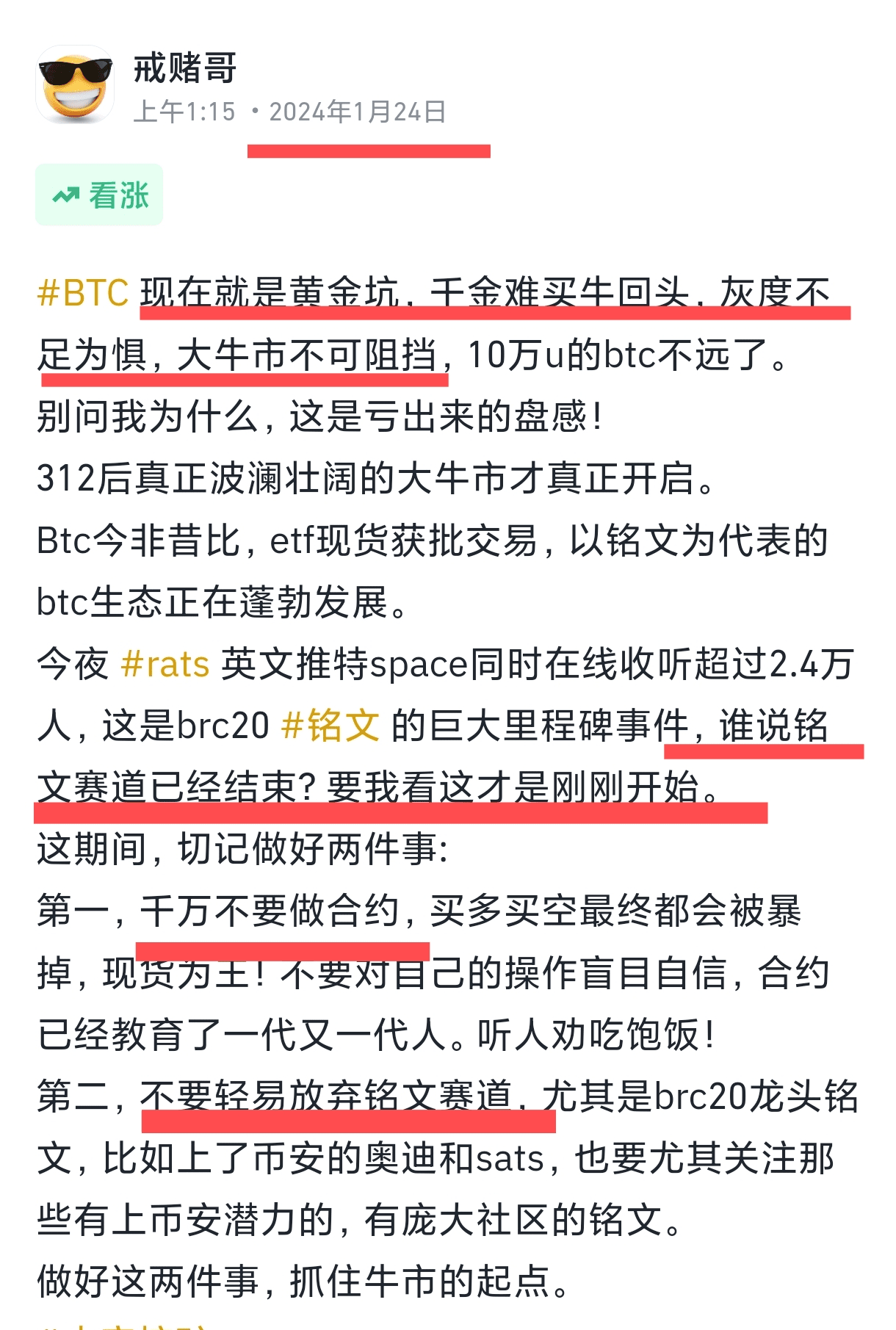 #BTC Als der Markt am pessimistischsten war, erinnerte Brother Gambling wiederholt alle daran, nicht in Panik zu geraten und die Aufschriften btc und brc20 nicht zu streichen. Damals meinte jemand, ich sei entweder dumm oder schlecht. In nur wenigen Tagen waren die BTC- und #铭文 -Märkte sehr erfolgreich und erlebten einen heftigen Aufschwung, der wirklich erfrischend war.
