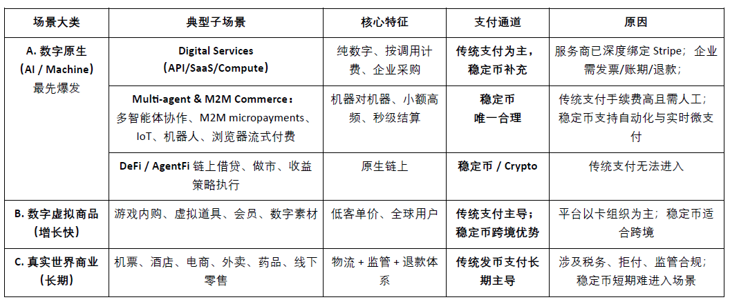 Das Haupthindernis für die breite Anwendung von Stablecoins im realen Handel ist nicht allein die Technologie, sondern auch die Regulierung (KYC/AML, Besteuerung, Verbraucherschutz), die Händlerbuchhaltung (illegale Zahlungen mit Stablecoins) und das Fehlen von Streitbeilegungsmechanismen für unwiderrufliche Zahlungen. Aufgrund dieser strukturellen Einschränkungen ist es unwahrscheinlich, dass Stablecoins kurzfristig in stark regulierte Branchen wie das Gesundheitswesen, die Luftfahrt, den E-Commerce, den öffentlichen Sektor und die Energieversorgung Einzug halten werden. Ihre Implementierung wird sich primär auf Szenarien mit geringerem Regulierungsdruck oder auf Blockchain-native Anwendungen konzentrieren, wie z. B. digitale Inhalte, grenzüberschreitende Zahlungen, Web3-native Dienste und die maschinelle Wirtschaft (M2M/IoT/Agenten). Genau hier bietet sich die Chance für den Web3-nativen Handel mit intelligenten Agenten, einen Durchbruch in der Skalierung zu erzielen.