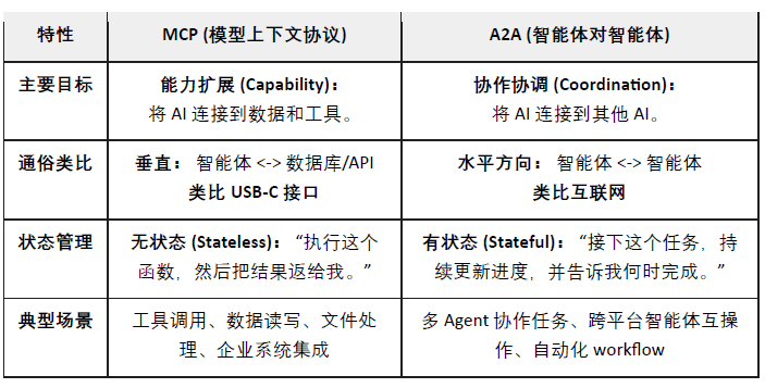 A2A befasst sich mit der Frage, „wie ein Agent mit anderen Agenten zusammenarbeiten kann“ – durch die Etablierung nativer Kommunikationsstandards für intelligente Agenten über verschiedene Anbieter und Frameworks hinweg, die Unterstützung von mehrstufigen Dialogen, Aufgabenzerlegung, Zustandsverwaltung und Ausführung über lange Lebenszyklen hinweg und dient als grundlegende Interoperabilitätsschicht zwischen intelligenten Agenten.
