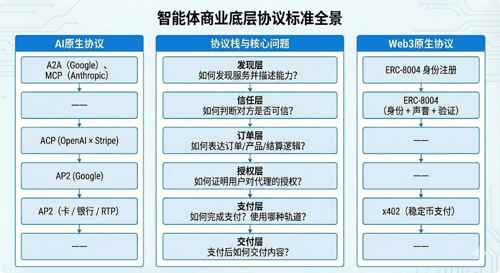 Agentischer Handel bedeutet die Etablierung einer völlig neuen, von Maschinen dominierten Wirtschaftsordnung. Es geht nicht einfach darum, dass KI automatisch Bestellungen aufgibt, sondern vielmehr um die Rekonstruktion einer gesamten unternehmensübergreifenden Wertschöpfungskette: wie Dienstleistungen gefunden, Vertrauen aufgebaut, Bestellungen formuliert, Berechtigungen erteilt, Werte abgerechnet und die Verantwortung für Streitigkeiten getragen werden. Die Entwicklung von A2A, MCP, ACP, AP2, ERC-8004 und x402 standardisiert das „geschlossene Geschäftsmodell zwischen Maschinen“.